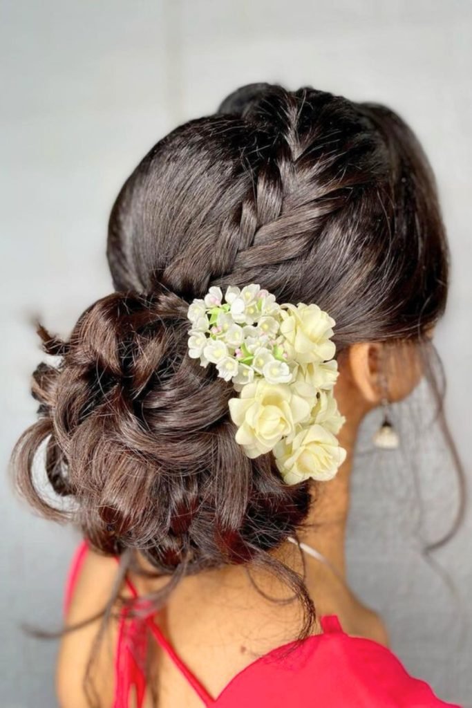 This hairstyle features a braided messy bun, accentuated with delicate floral accessories. The hair is intricately braided and styled into a low bun, giving it a structured yet relaxed look.