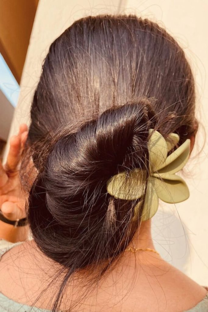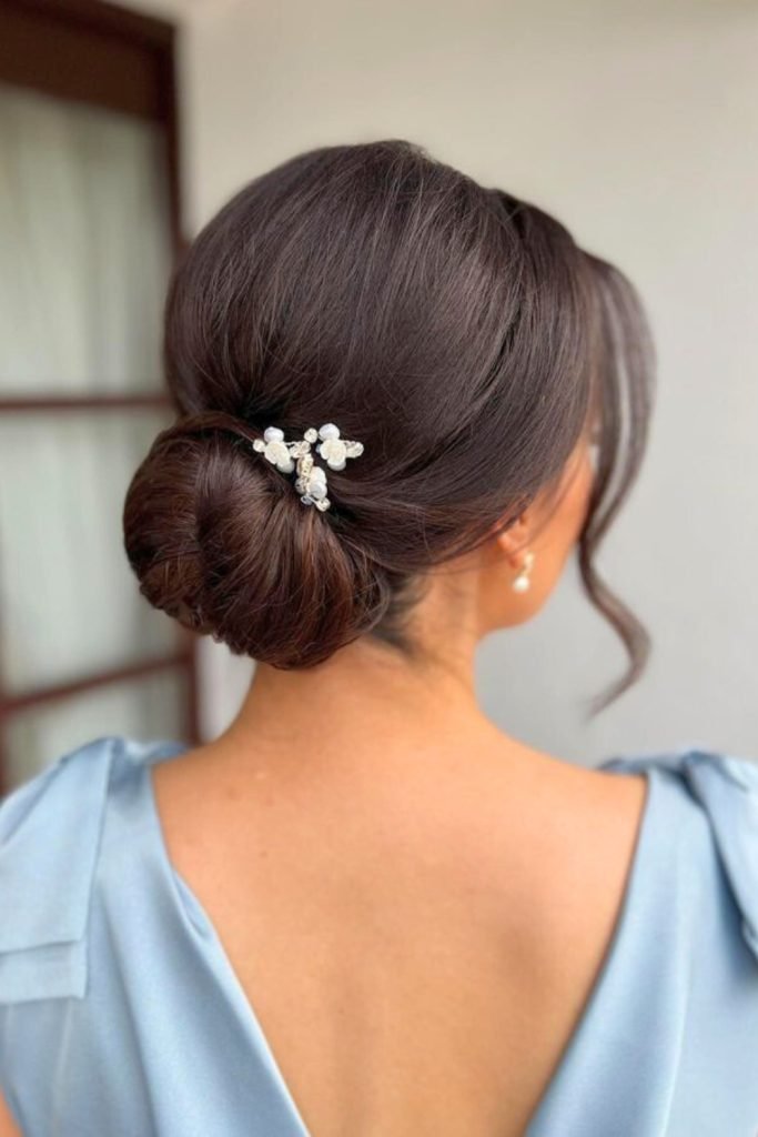 The hair is smoothly gathered at the nape of the neck, twisted into a bun, and secured with a stylish clip.