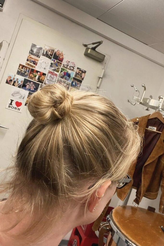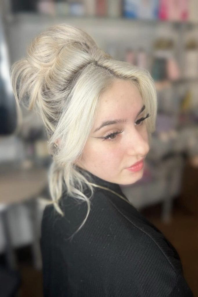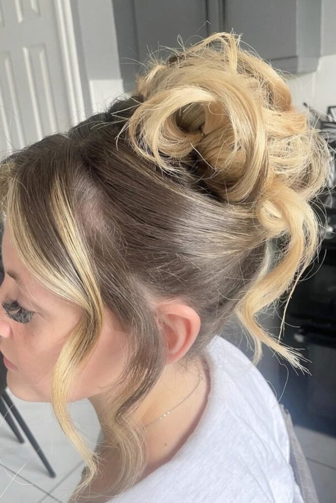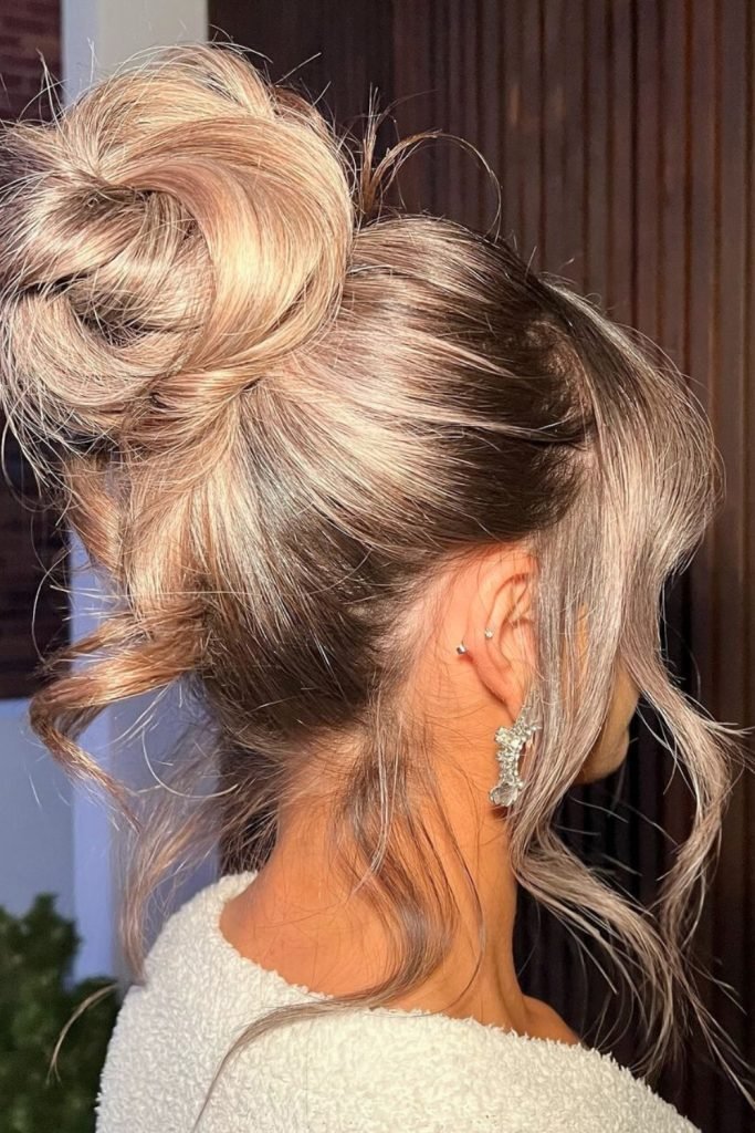 This voluminous blonde messy bun is all about casual elegance with a hint of playfulness.