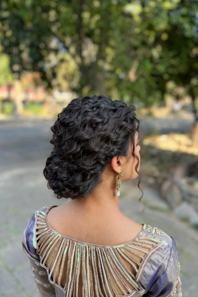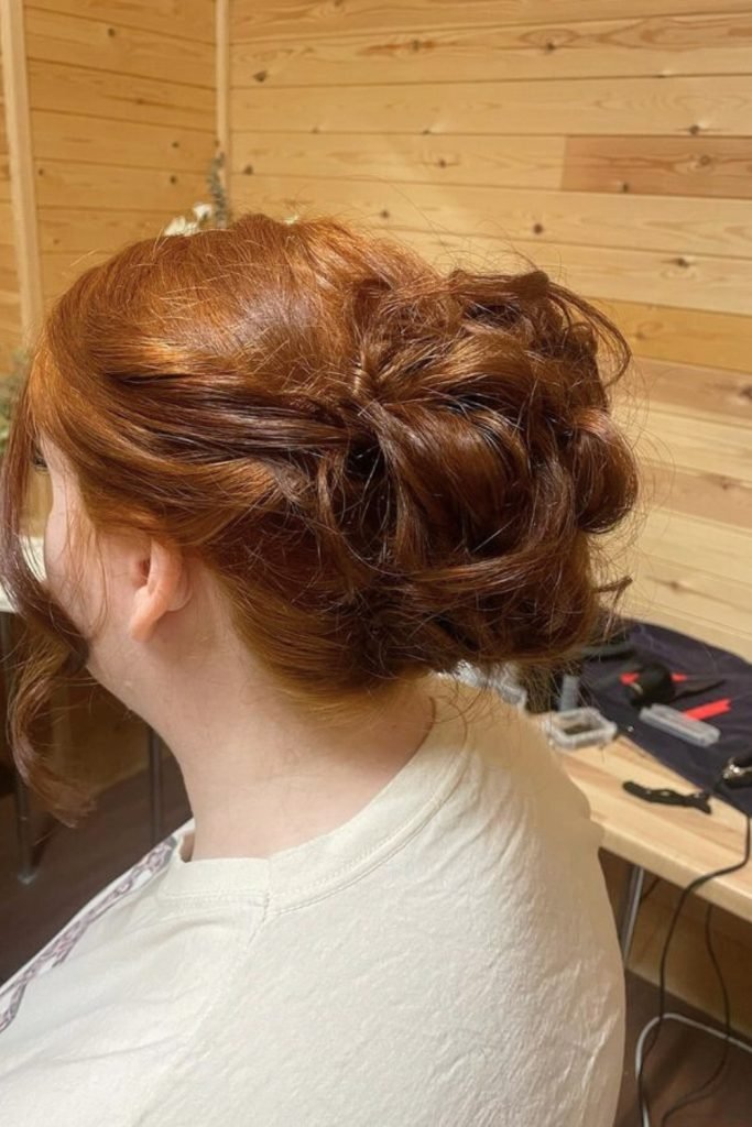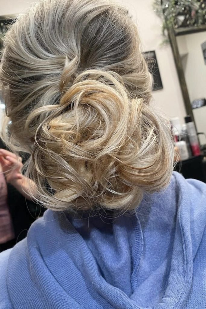 The hair is gathered loosely, creating soft, cascading curls that frame the face and add a romantic vibe. The bun itself is full of texture, giving it a slightly undone yet sophisticated appearance.