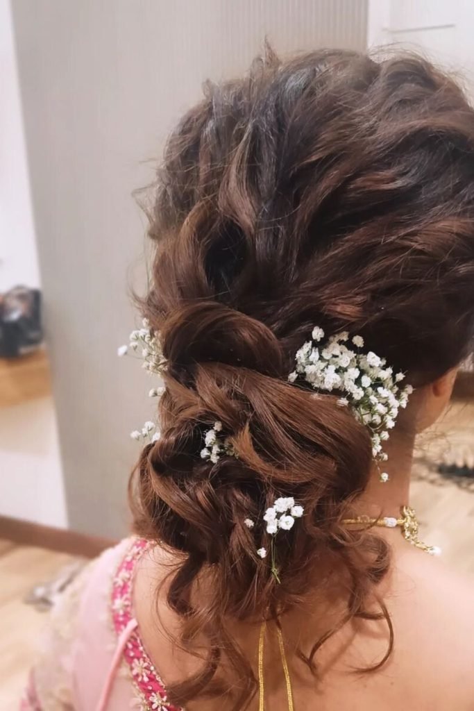 The hair is loosely gathered and secured at the back, allowing soft, voluminous curls to frame the hairstyle. Small white flowers are interwoven, adding a touch of whimsy and elegance.