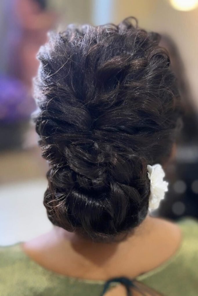 This voluminous textured messy bun adds an element of elegance with its rich texture and intricate detailing.