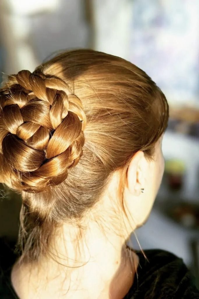 The hairstyle features a beautifully woven braid forming the bun, creating a unique texture and visual appeal.