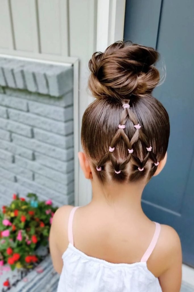 The hair is styled into a high messy bun with a detailed crisscross pattern on the back, held together by small hair ties.