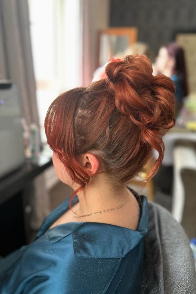 The hair is styled into a high bun with abundant volume, creating a sophisticated look that’s perfect for special occasions.