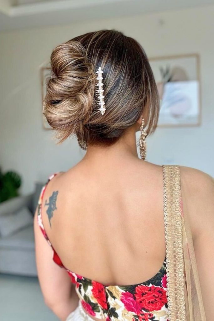 Ideal for summer events or a chic everyday style, this messy bun exudes effortless sophistication while maintaining a carefree vibe.