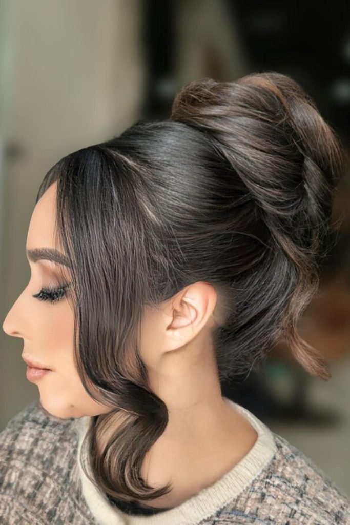 This hairstyle features a voluminous high messy bun, perfect for those who want to add height and drama to their look.