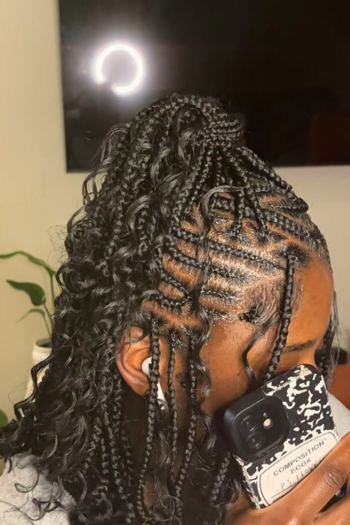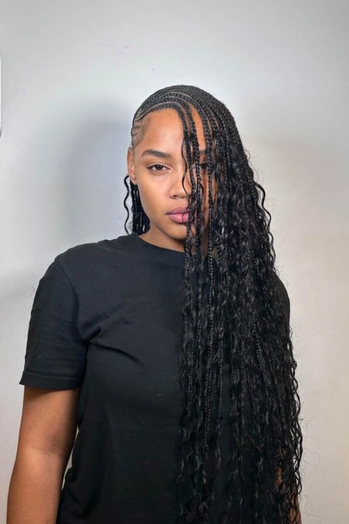 This hairstyle highlights a striking contrast, adding depth and drama to the overall appearance. The intricate cornrows seamlessly blend into the longer twists, creating a dynamic and modern style.