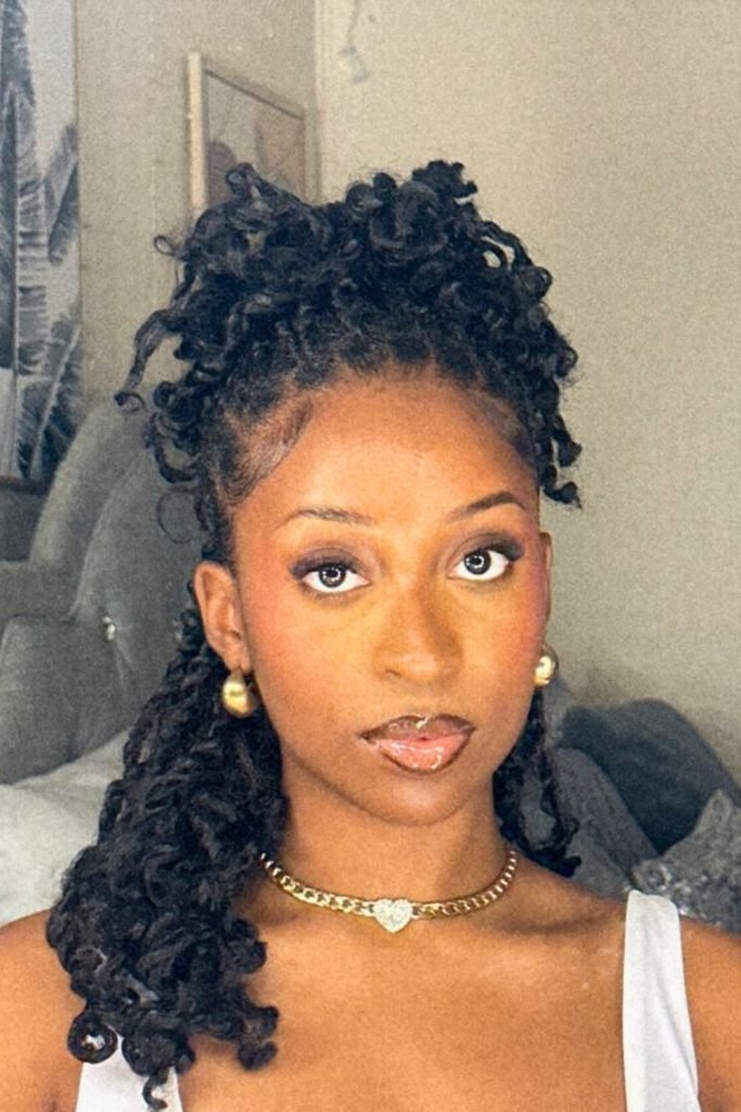 The mix of tightly coiled twists and loose curls creates a dynamic and textured look. Ideal for both casual outings and formal events, this hairstyle offers versatility and a chic, polished appearance.