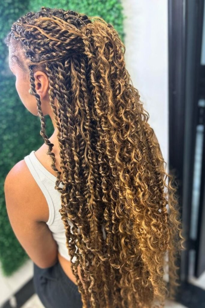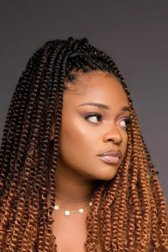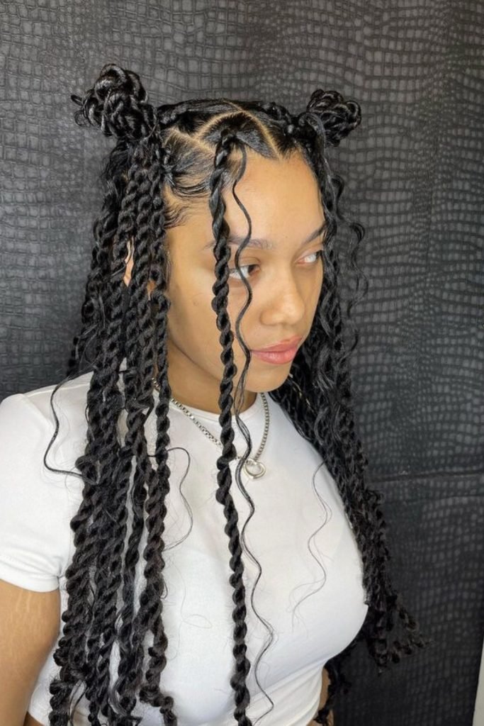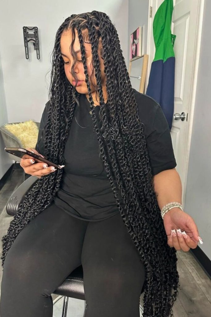 The twists are styled to create voluminous, curly ends that cascade down, adding both texture and movement.