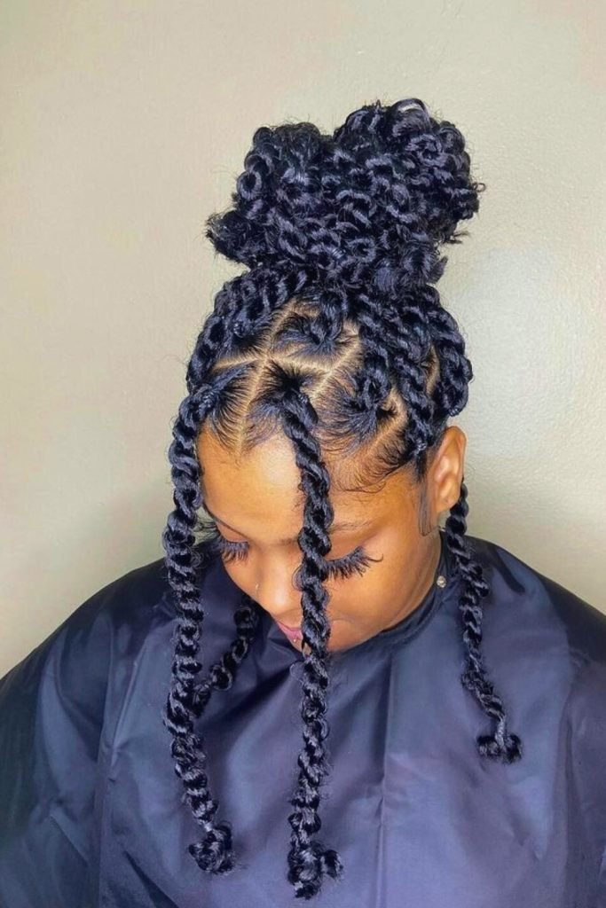 This hairstyle features intricately twisted sections gathered into a voluminous high bun, with a few twists left hanging down to frame the face.