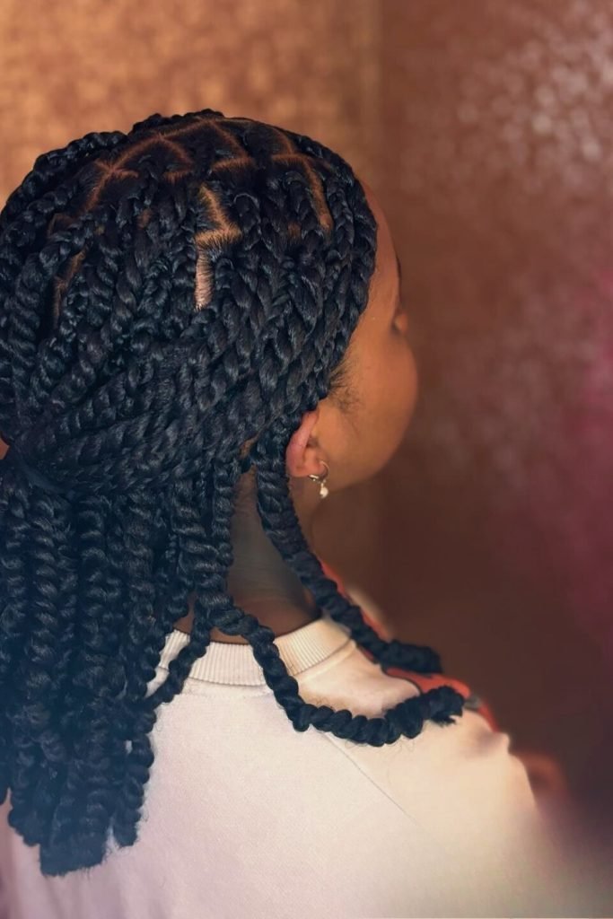 The thick twists create a striking texture that adds depth and dimension to the hair. The neat parting at the roots ensures a clean and polished appearance, while the loose ends give a relaxed, bohemian vibe.