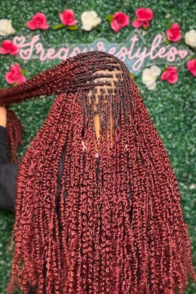 Cherry Blossom Twists bring a vibrant and colorful twist to traditional passion twists. This hairstyle features a stunning cherry red hue, creating a bold and eye-catching look.