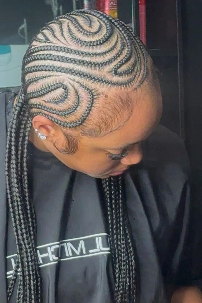 This design features meticulously crafted cornrows forming intricate swirl patterns across the scalp.