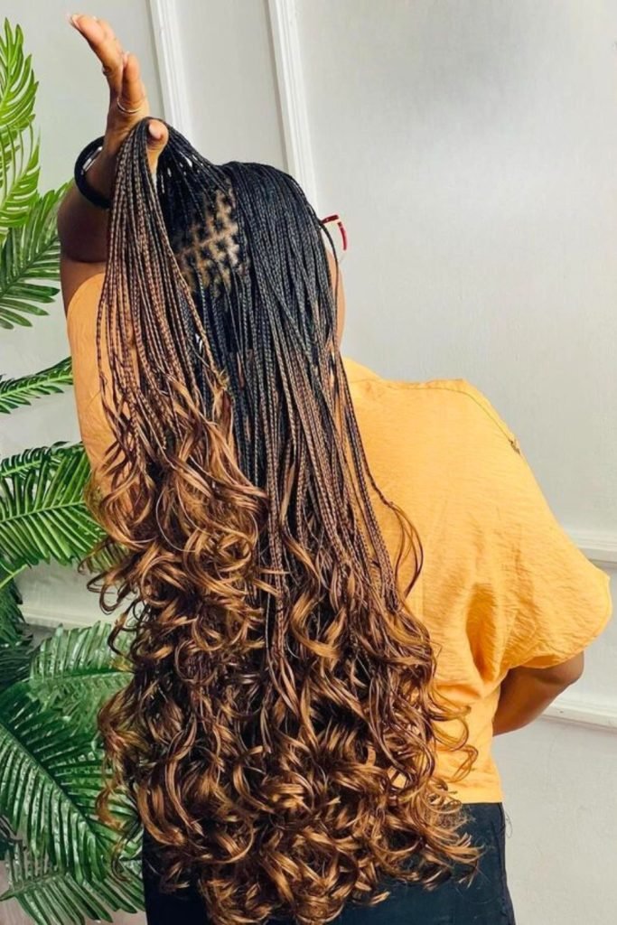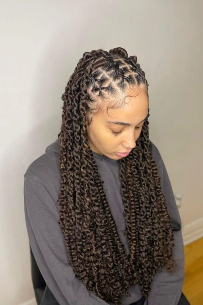 The roots are expertly braided in neat patterns, which then flow into free, spiraling twists that bounce with movement.