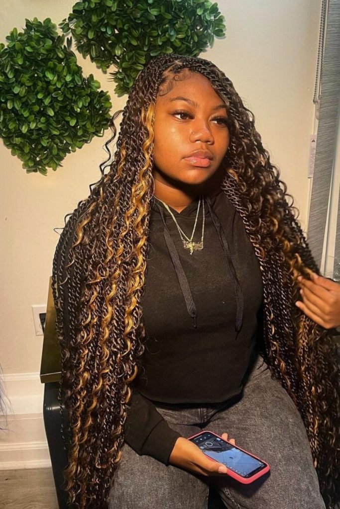 The Highlighted Passion Twists add a vibrant touch to the traditional style with strategically placed golden highlights.
