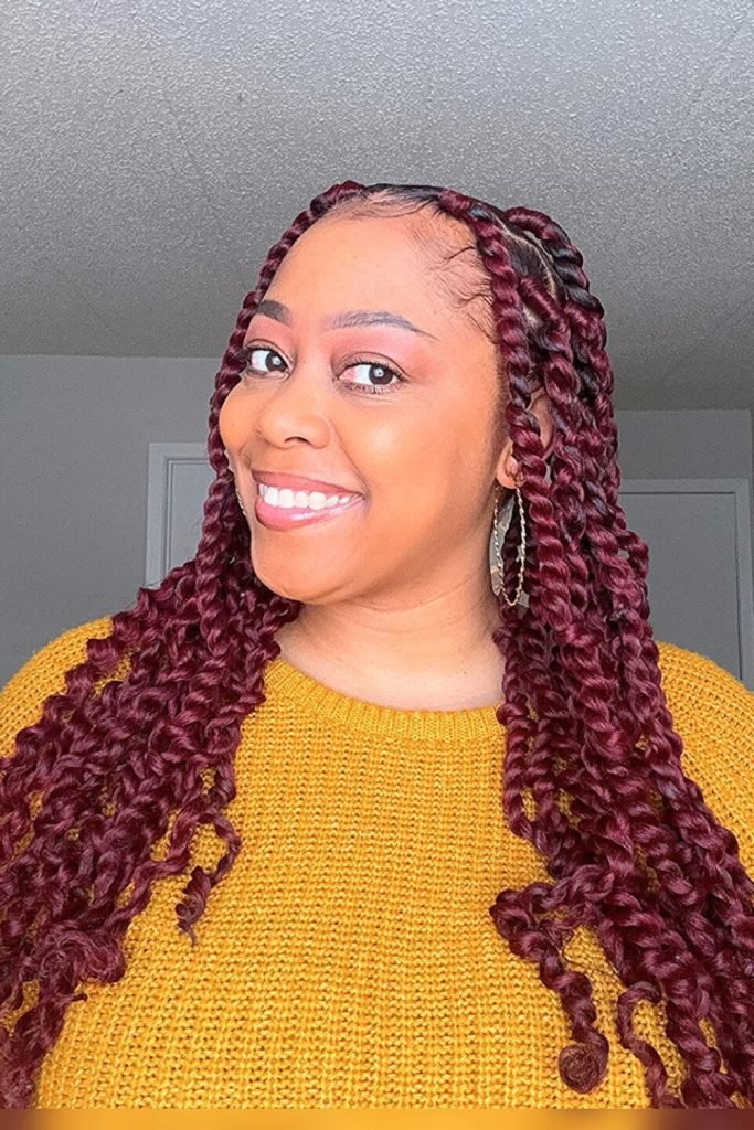 This hairstyle pairs the intricate twists of traditional passion twists with a deep merlot color, creating a visually stunning contrast against the wearer’s bright smile and yellow attire.