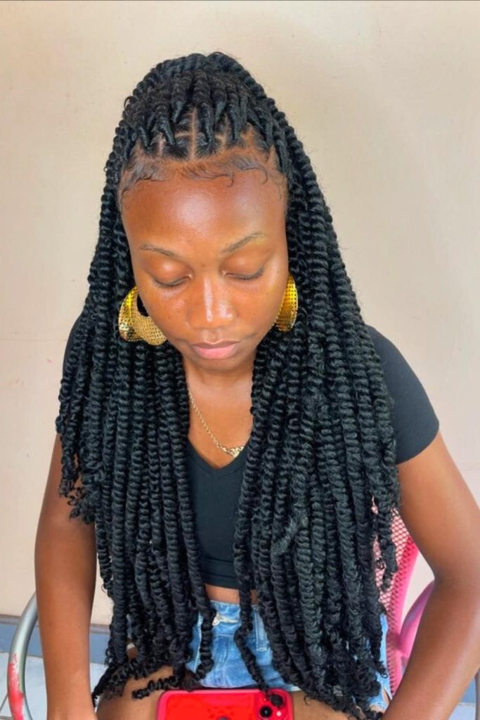 The Half-Up Half-Down Passion Twists combine elegance and practicality. This style features long, flowing twists that cascade down the back, while the top section is pulled up, adding volume and a touch of sophistication.