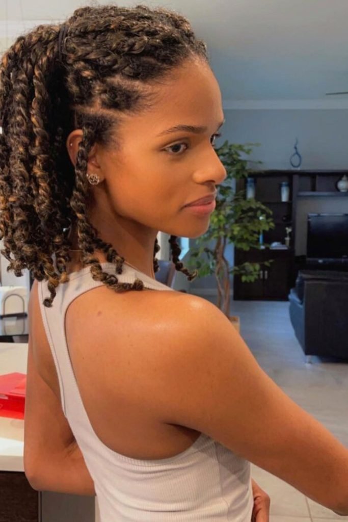 These twists are crafted with two strands of hair, intricately twisted together to form spirals that cascade down her back, providing both flair and function.