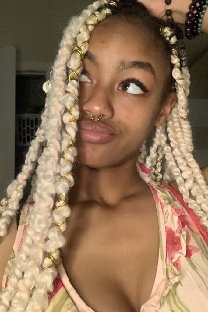 This hairstyle features creamy blonde twists interspersed with thin golden wires wrapped around them, adding a touch of glimmer and sophistication.