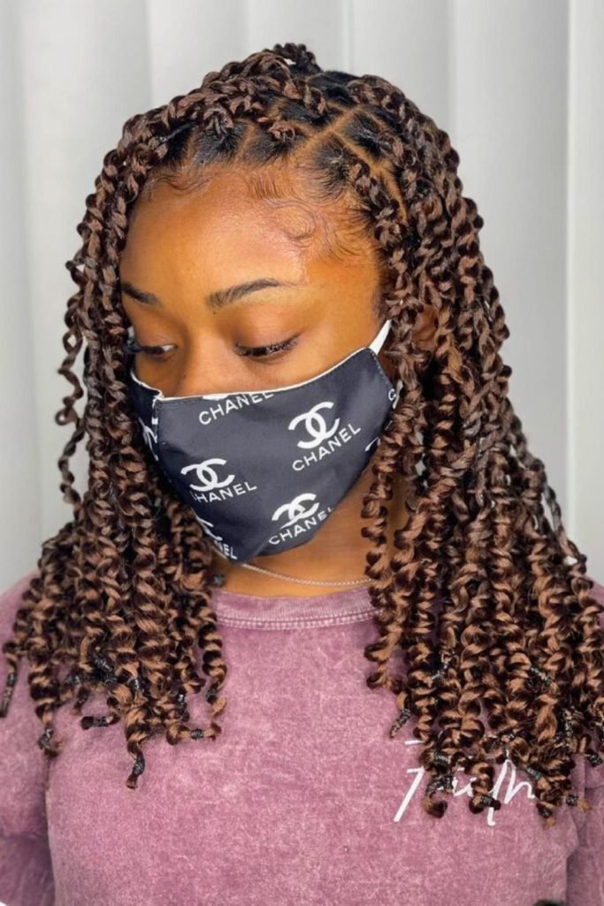 This shoulder-length passion twist hairstyle offers a chic and manageable look. The twists are styled into loose, bouncy curls that frame the face beautifully, adding volume and texture.