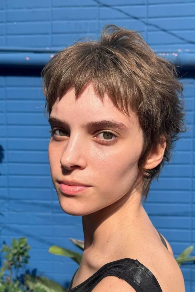 This textured tousled pixie cut features a mix of short, choppy layers that create volume and movement.