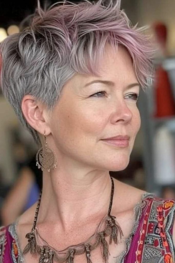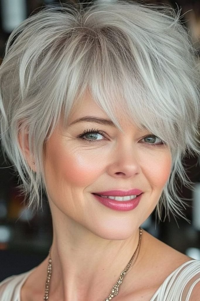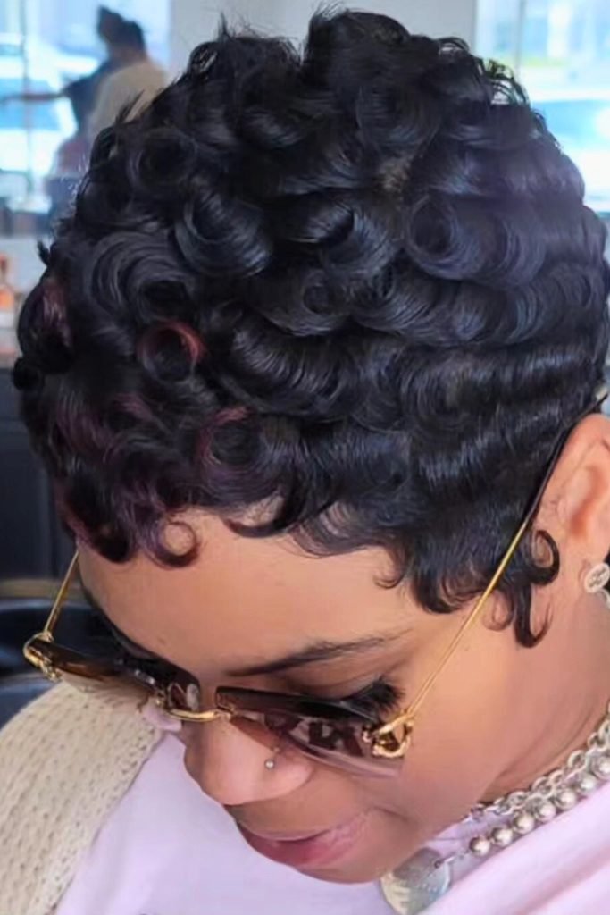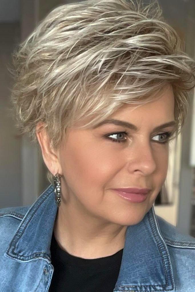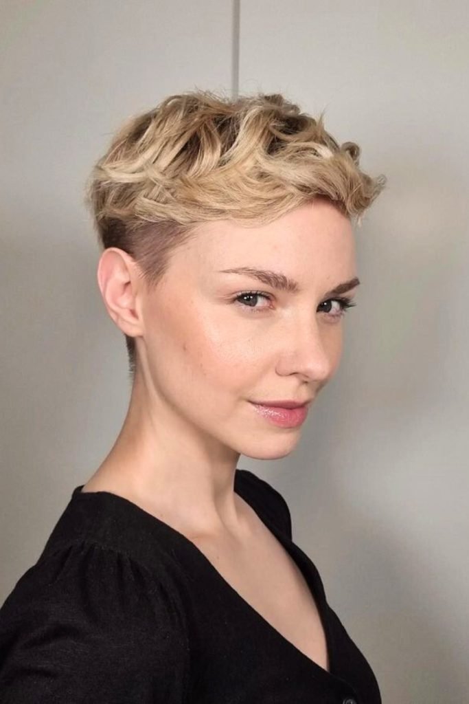This textured pixie cut features soft, tousled waves on top, creating a playful and dynamic silhouette.