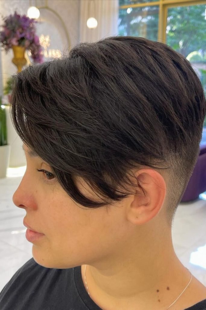 This edgy undercut pixie cut for dark brown hair showcases a bold and contemporary style.