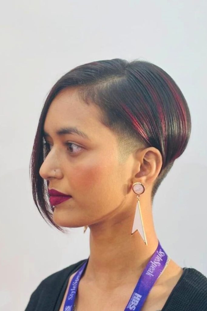This edgy undercut pixie cut features dark brown hair accentuated with light highlights, giving it a bold and striking look.