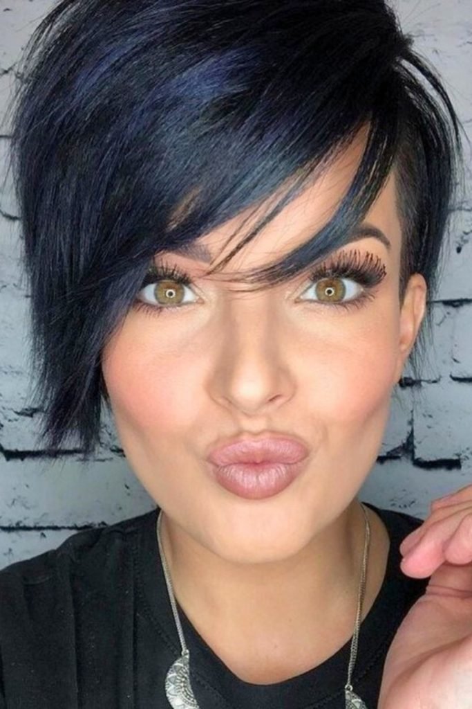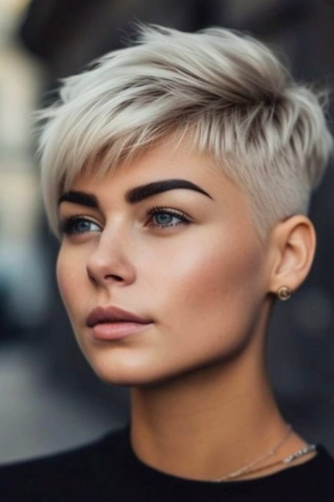 This side-swept pixie cut exudes effortless cool, with long, sweeping bangs that frame the face and add a touch of drama.