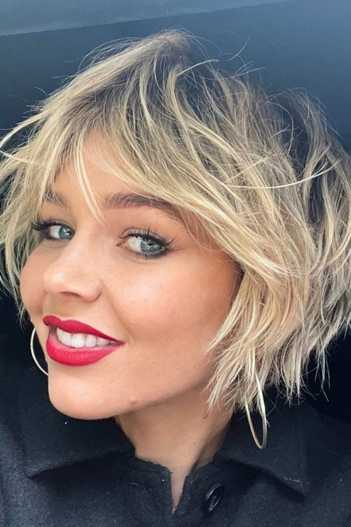 This tousled bob showcases a playful, textured look with layers that create movement and volume.