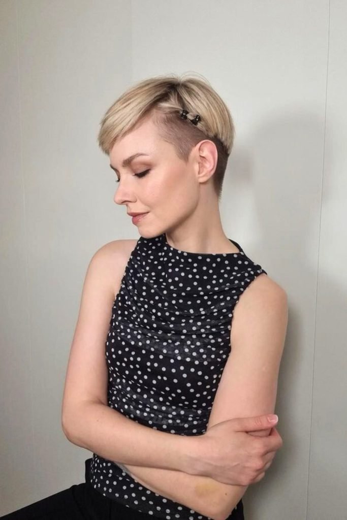 The undercut sides create a sharp contrast with the longer, smooth top, which is neatly styled with a side part and adorned with a chic hairpin.