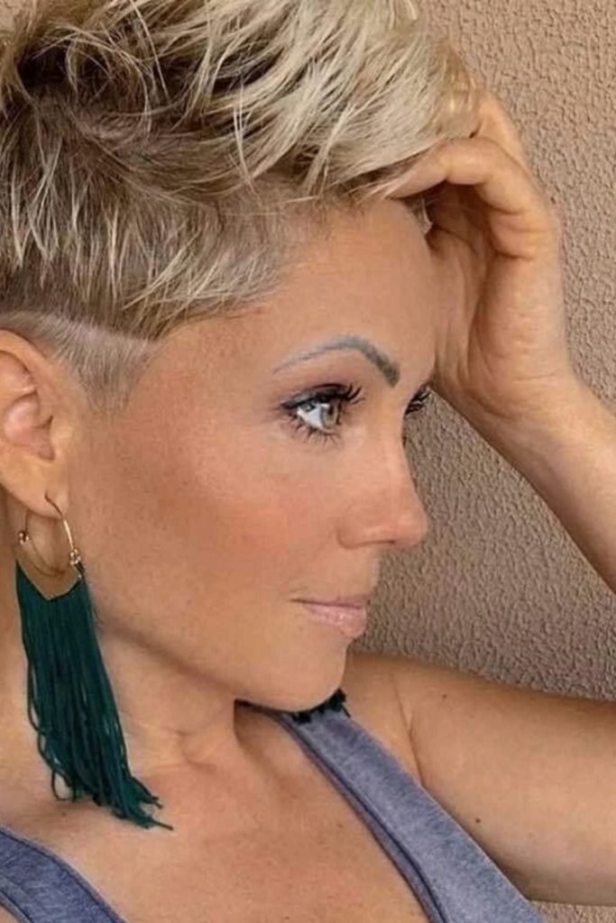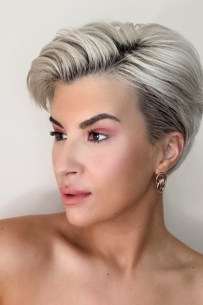 This frosted undercut pixie features closely shaved sides that contrast dramatically with the longer, textured top.