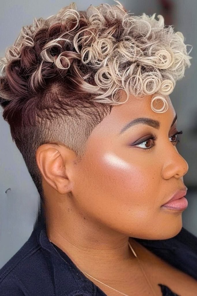 The undercut sides provide a striking contrast, accentuating the volume and movement of the curls above.