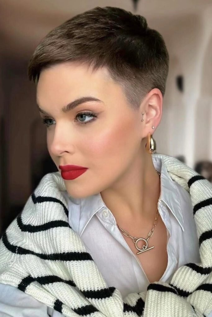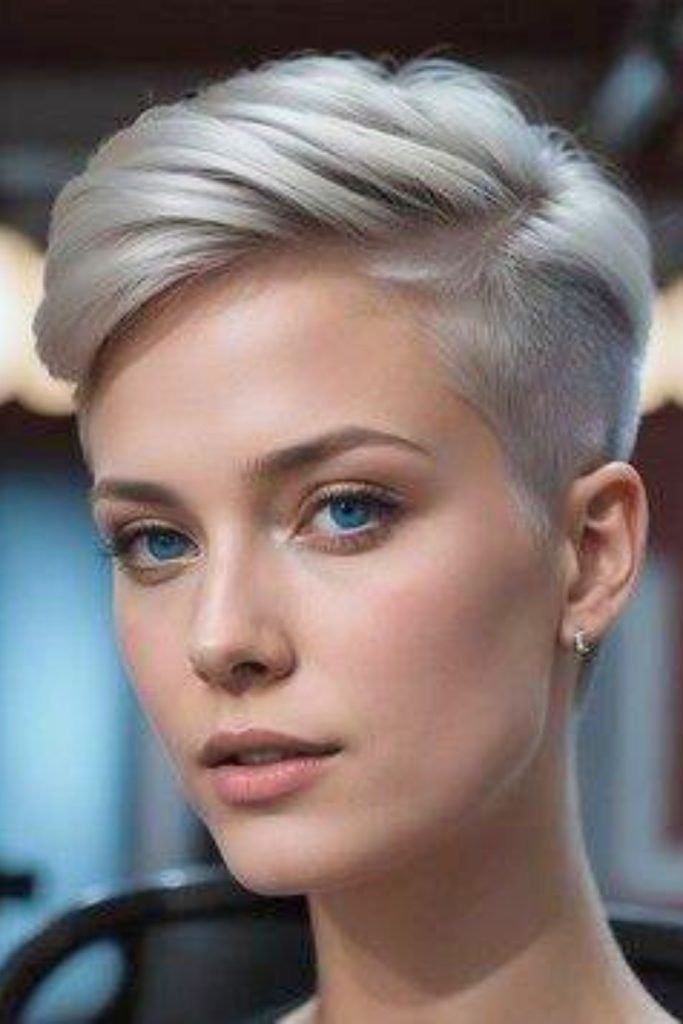 This sleek undercut pixie cut features a dramatic contrast between the closely cropped sides and the longer, textured top.