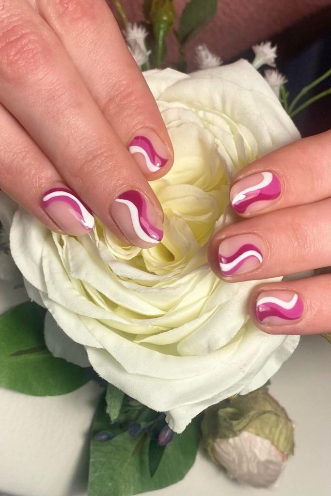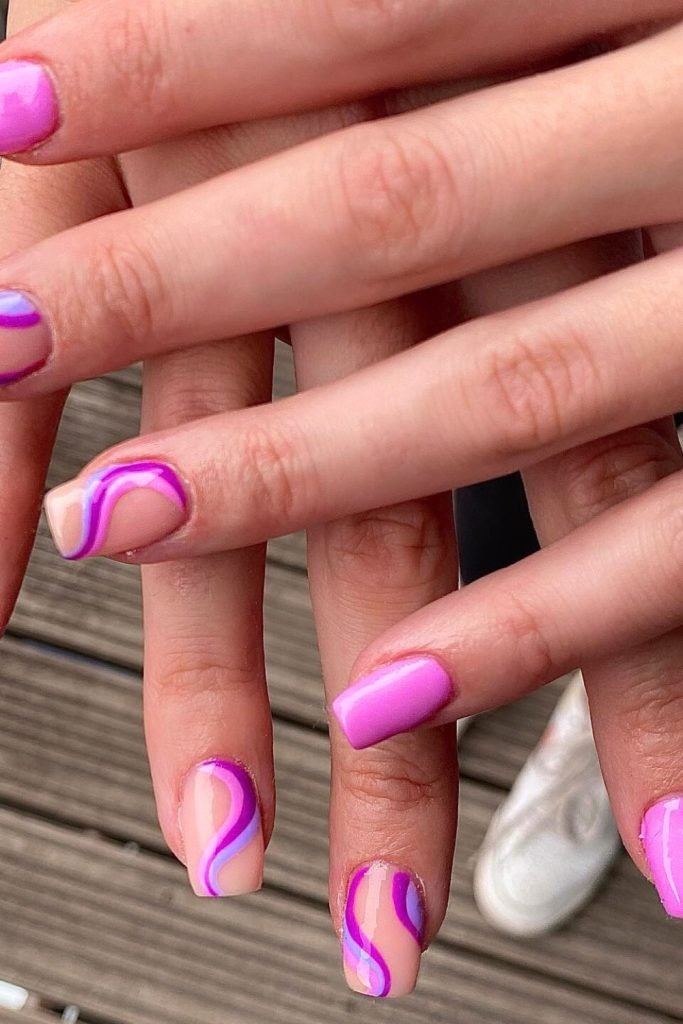 This playful nail design features a vibrant interplay of pink and purple hues. The nails alternate between solid pink polish and a nude base with dynamic wave patterns.