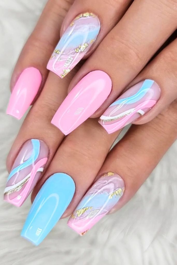 The nails feature a mix of solid pastel pink and blue with accent nails that showcase delicate swirls of pink, blue, and white.