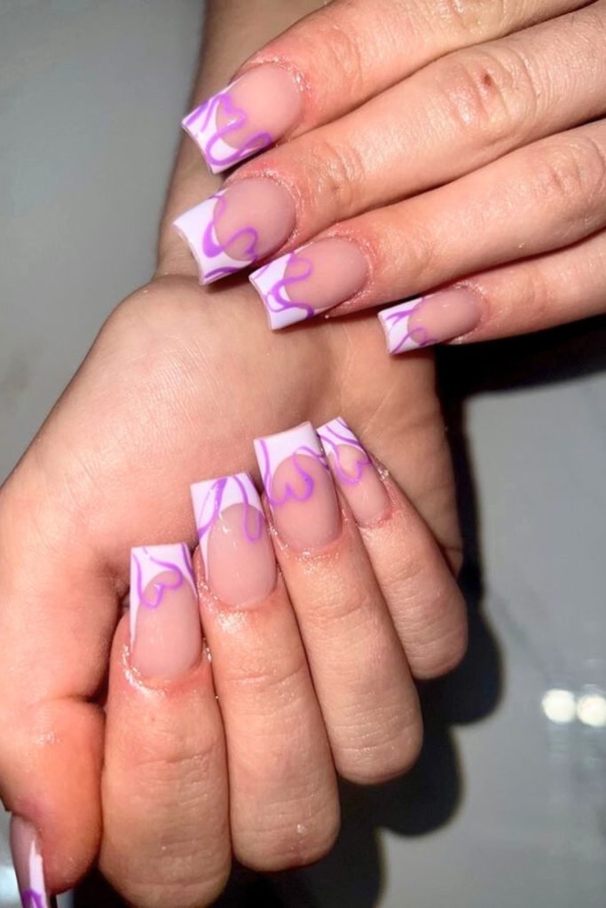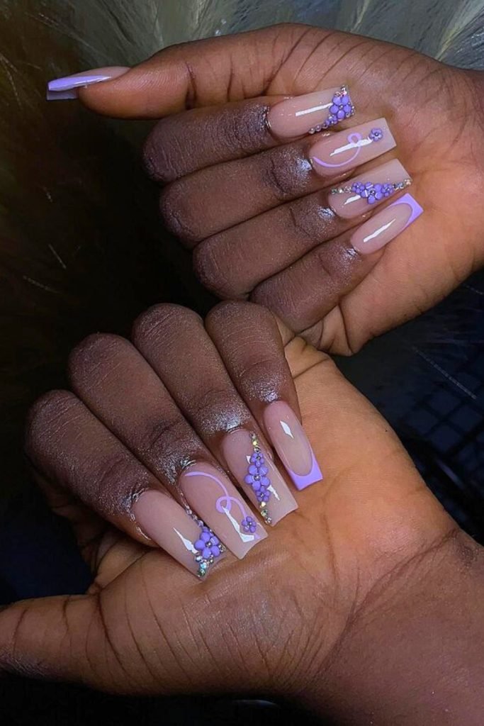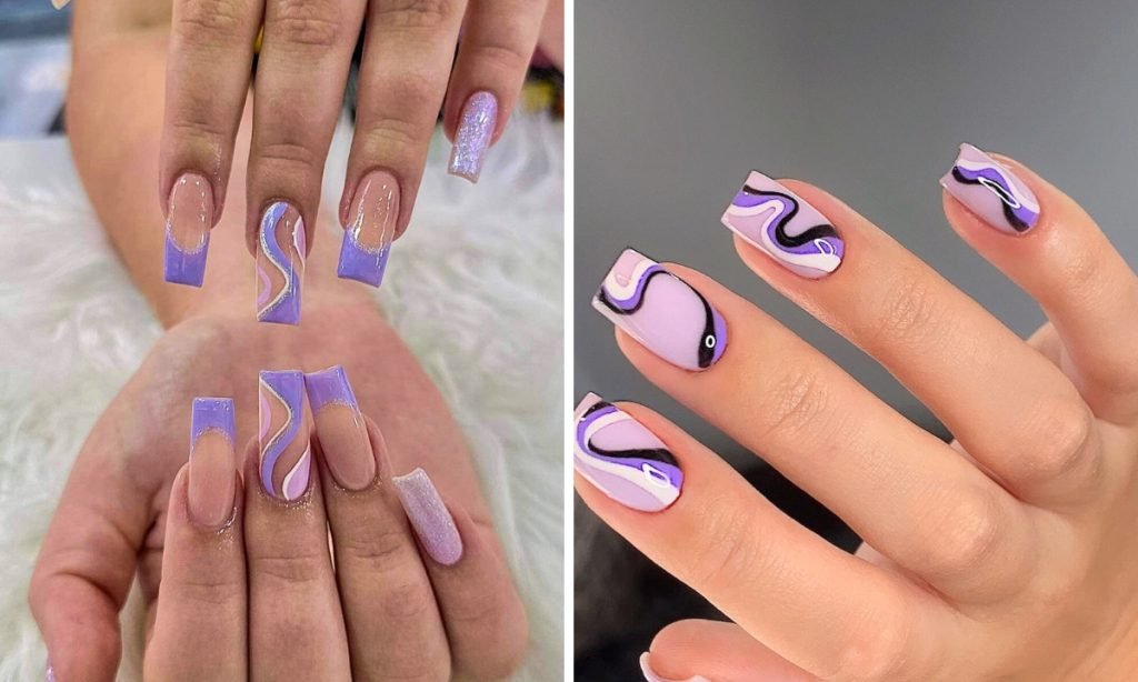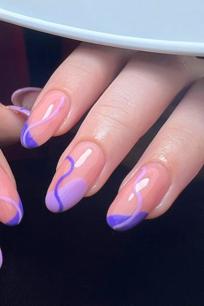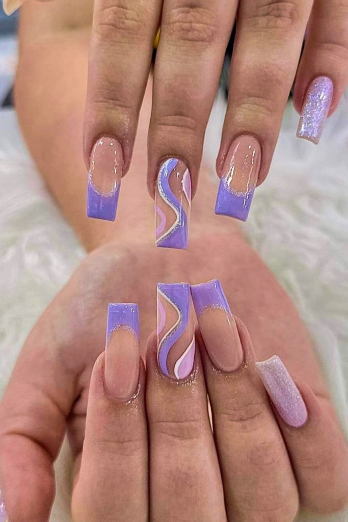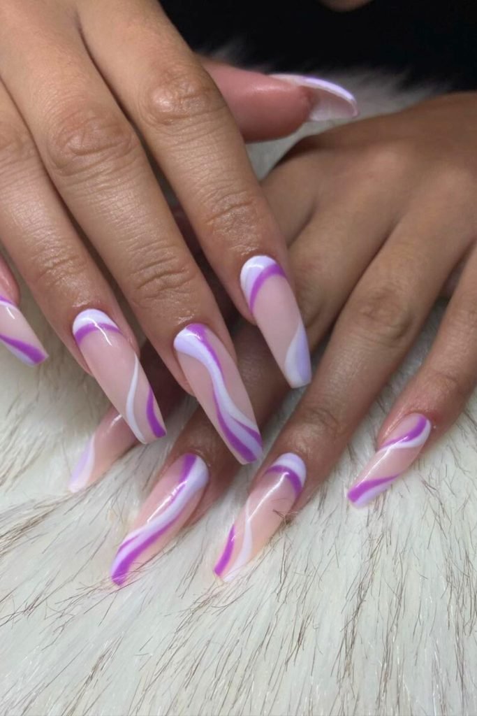 This design combines a nude base with playful lavender and purple swirls, creating a fresh and modern look.