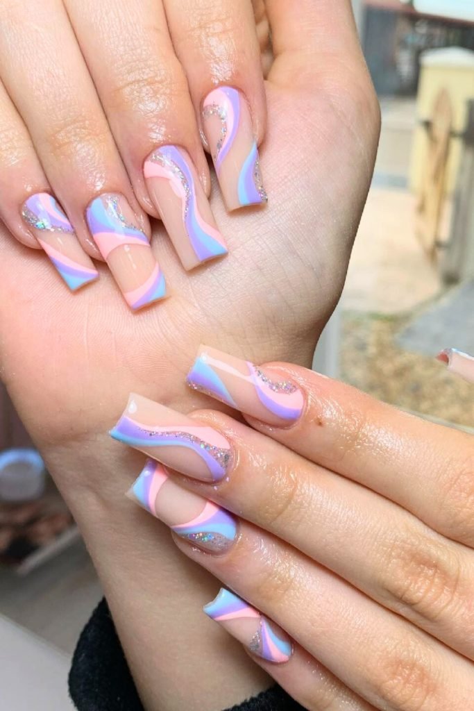 This captivating nail design showcases a nude base accentuated with pastel swirls of pink, blue, and lavender.