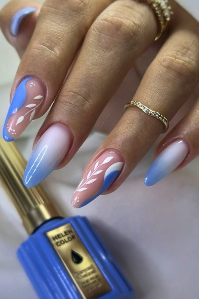 This serene nail design beautifully transitions from a soft nude base to a calming blue ombré.