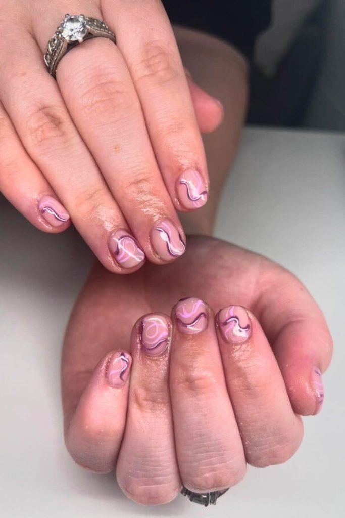 This chic nail design showcases short nails adorned with delicate marble-like swirls in shades of pink and lilac.