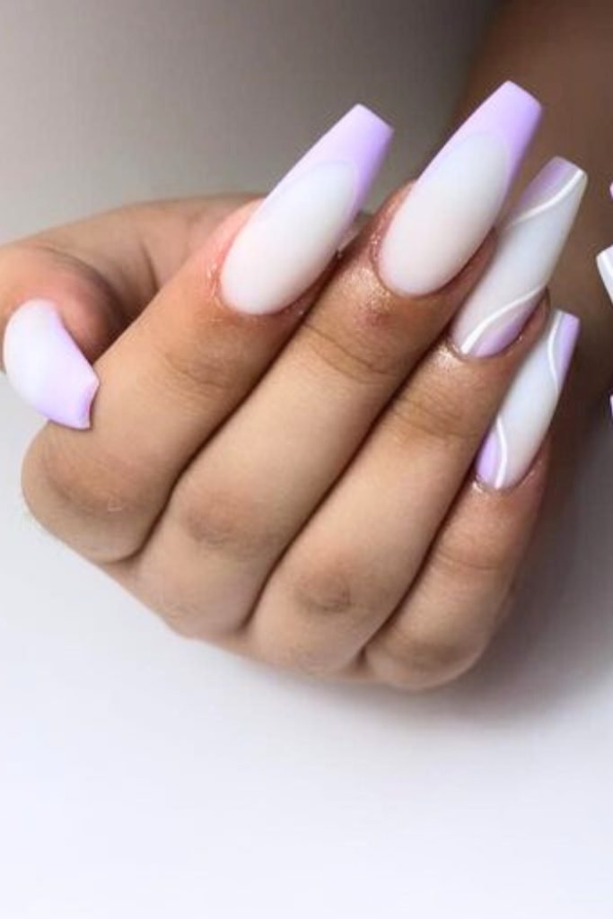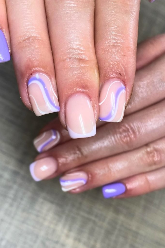 This nail design features a sophisticated combination of a nude base with lavender and white wave accents.