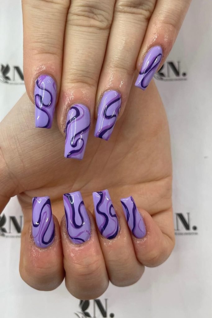 This striking nail design features a monochromatic lavender base accented with deep violet swirls.
