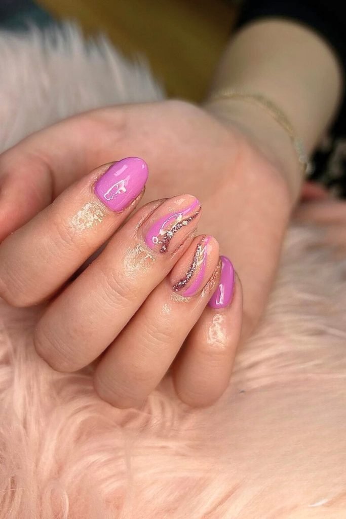 The accent nails showcase a blend of nude and pink, adorned with elegant gold and purple swirls that add a touch of sparkle and depth.