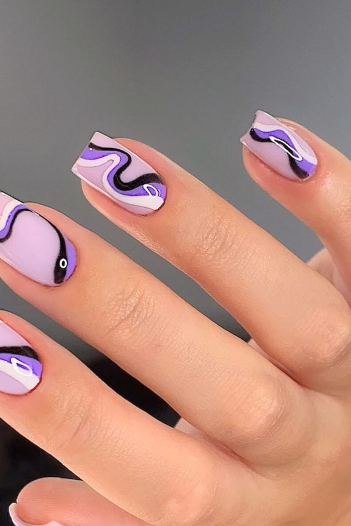 This nail design stands out with its modern abstract aesthetic. The base color is a soft lavender, which provides a serene backdrop for the bold, black, and purple swirls.