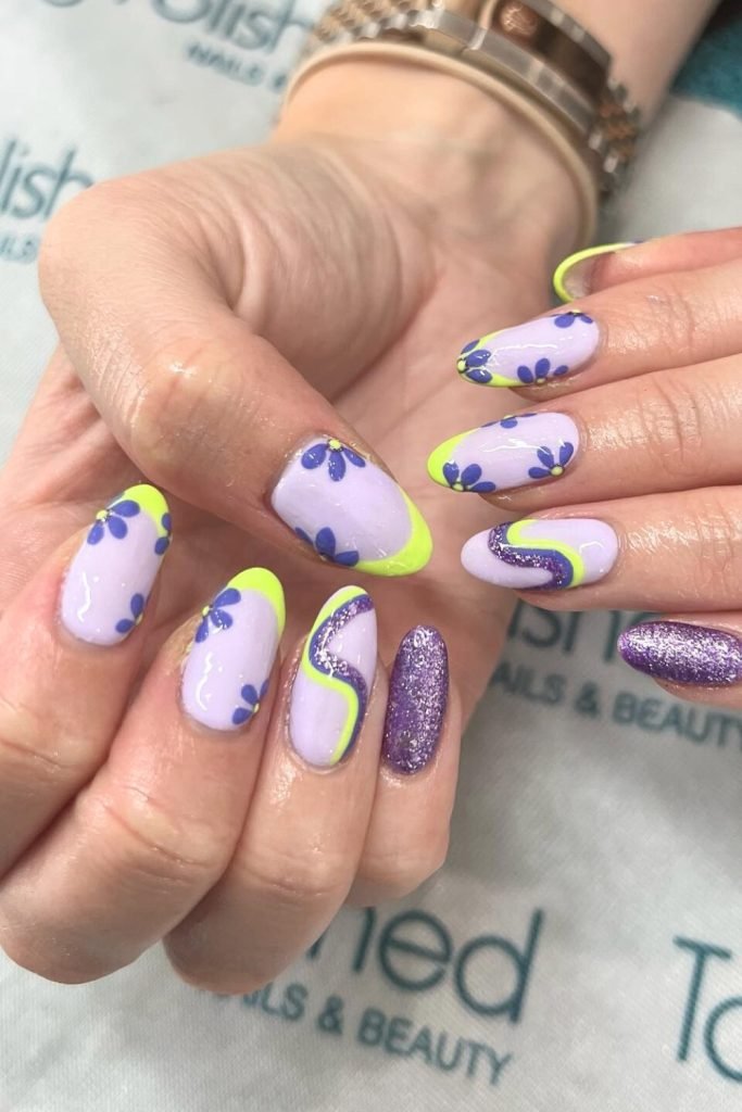 The nails are painted in a soft lavender base, adorned with vibrant neon green tips and blue daisy-like flowers.