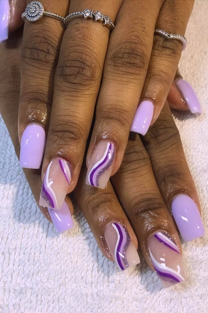 The soft lavender hue covers most nails, offering a serene and calming vibe. On accent nails, clear polish is adorned with graceful white and dark purple swirls, adding a dynamic contrast.