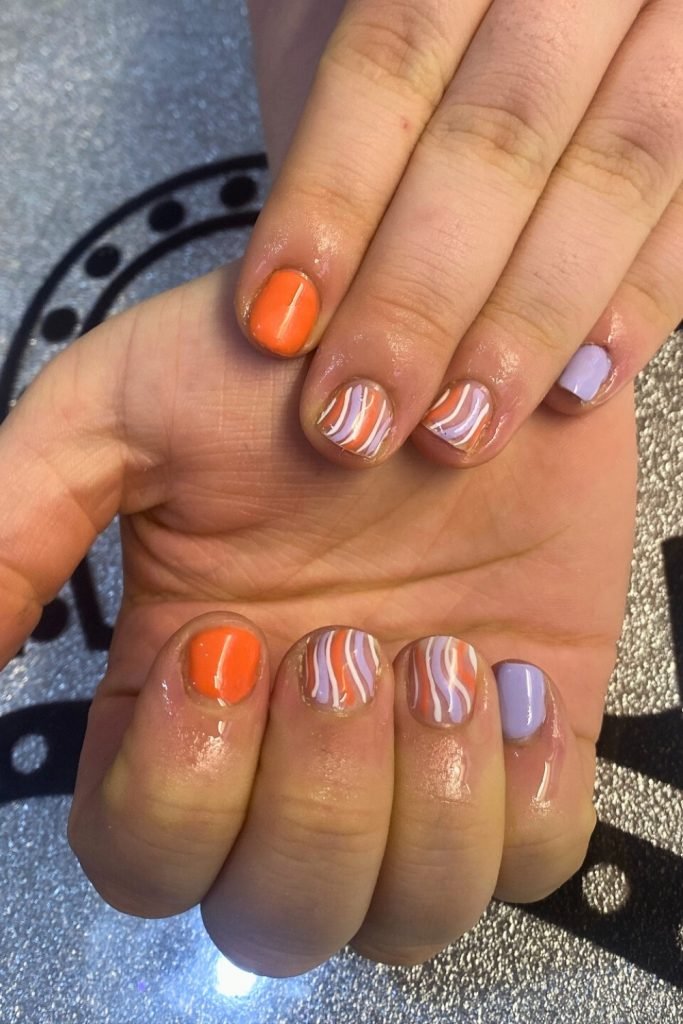 This nail design bursts with the lively energy of spring. The short nails are painted in a playful mix of bright orange, soft lavender, and intricate swirls.