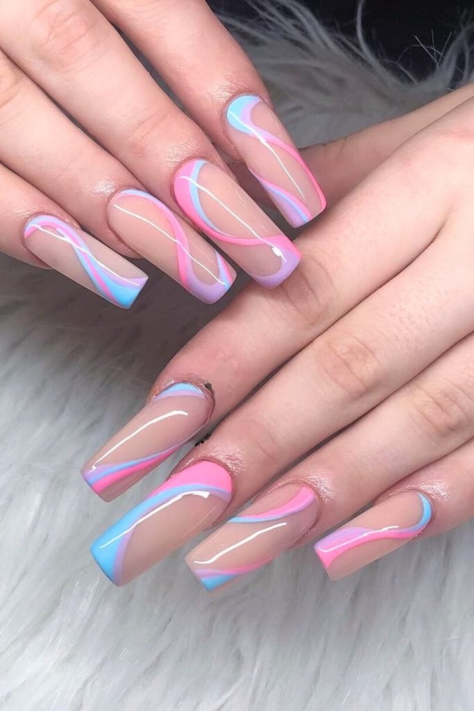 This enchanting nail design features a delightful blend of pastel pink and blue swirls on a nude base.