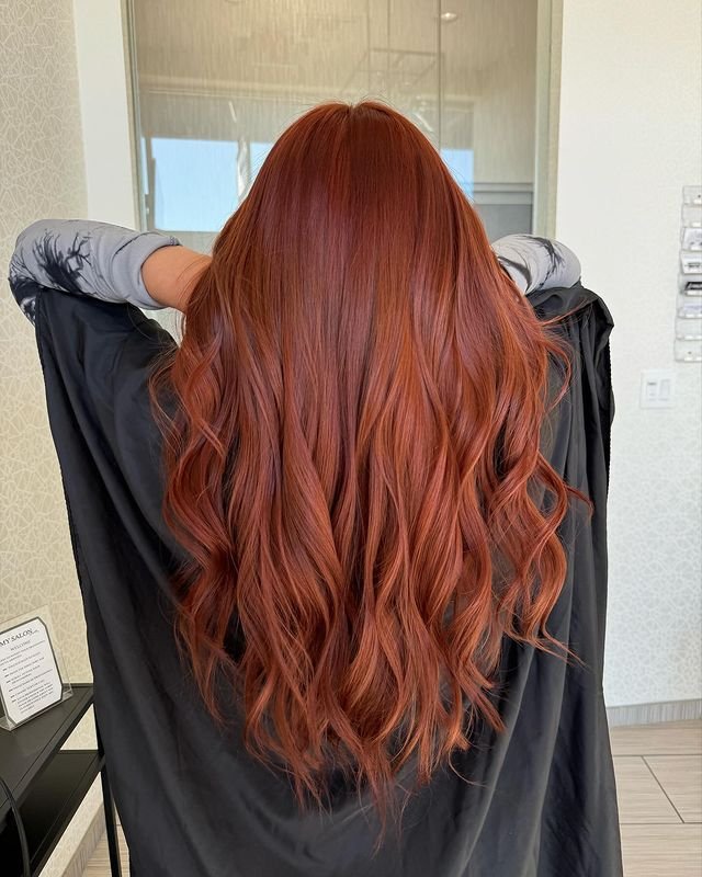 Starting with a darker red root that flows into a vivid copper mid-length, this look is achieved through ombre dyeing techniques.